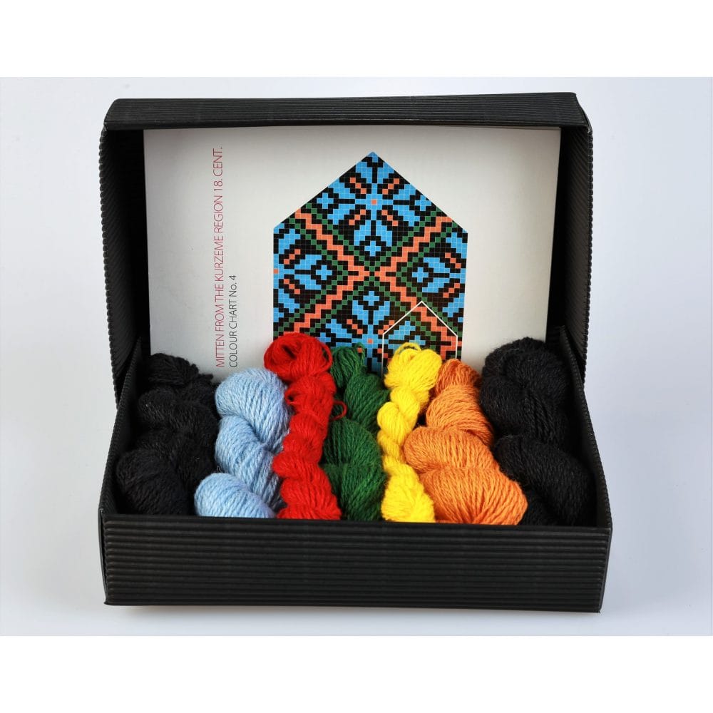 Med Hobbywools vantkit kliver du rakt in i Lettlands levande sticktradition. Varje kit innehåller allt du behöver för att skapa ett par klassiska, mönstrade vantar i 100 % ull. Vantkit Kurzeme 4 ger dig denna upplevelse med sina unika design. Du följer tydliga instruktioner och arbetar med garn som Ieva Ozolina själv färgar och väljer ut med omsorg.